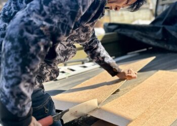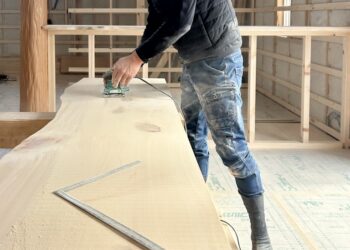 新築現場にて ヒノキ🌳一枚板キッチンカウンター加工&オイル仕上げの様子💪