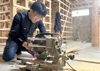 『大政木材商店 』製材工場 にてT様邸の造作家具の木曽檜天板ビンテージウッド加工の様子